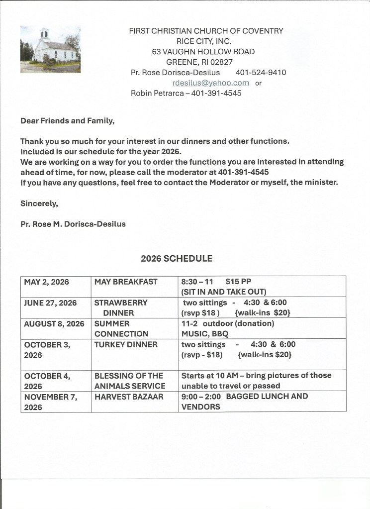 First Christian Church of Coventry RI, UCC – Worship 9:00 am Led by Rev. Rose Desilus